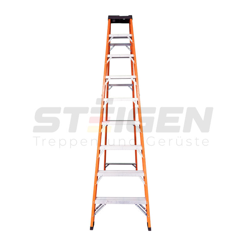 De origen Aleman, construida íntegramente con fibra de vidrio, proporcionando aislamiento eléctrico, esta escalera es certificada, por lo que cumple con todos los requerimientos de calidad y pruebas de resistencia de acuerdo a las normas ANSI, tiene una capacidad máxima de carga de 150 kilos, para uso industrial, es extremadamente duradera. Su mecanismo es fácil de usar y seguro.